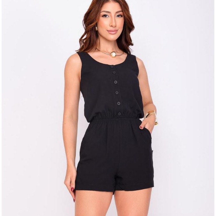 MACAQUINHO FEMININO COM BOTÕES FRONTAIS E BOLSO LATERAIS COR PRETO FRESCO PARA O VERÃO COM ELASTICO NA CINTURA .
