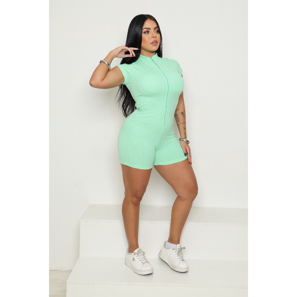 Macaquinho fitness Moda Verão Gringa Virginia Shorts Curto Zíper Frontal Tecido Anarruga