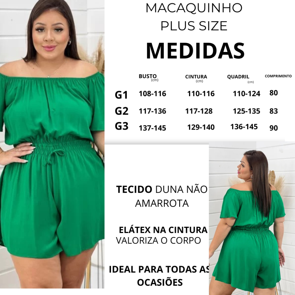 Uma peça única irresistível que conquistou as mulheres de atitude na moda, o macacão ciganinha curto é tendência para o ano todo. Repleto de detalhes maravilhosos e claro, o decote ombro a ombro. O macacão ciganinha valoriza seu corpo e suas formas, seja audaciosa e invista em mais essa opção para ganhar um guarda-roupa versátil. E para marcar presença com um visual charmosa e bem feminina, o macacão ciganinha é sua escolha certa. Arrase no salto alto e desfile toda sua confiança para encarar o trabalha no look discreto e refinado. Valorize seu estilo com mais esse conceito da moda. -TECIDO DUNA -•Sua principal característica é a leveza o conforto além de ser fresco e não reter o calor . *Lastex na cintura valorizando suas curvas e deixando as acentuada* -Detalhe de amarração na Cintura dando elegância e estilo. com excelente material todo reforçado dando o uma durabilidade incrível. -Macaquinho Ciganinha. G1 ALTURA: 80 CM CINTURA:112-120 QUADRIL: 126-130 Cm BUSTO:124-128 Cm G2 ALTURA: 80 CM CINTURA:124-126 Cm QUADRIL : 132-138 Cm BUSTO: 132-138 Cm G3 ALTURA: 85 CM CINTURA:128-134 Cm QUADRIL : 140-150 Cm BUSTO: 140- 150 Cm