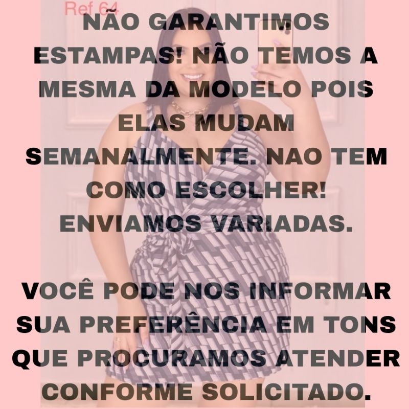Macacão plus size modelo short saia Tamanho GG: Veste do 44 ao 48 Tecido: Suplex Fit conhecido também como Malha Leila Tecido leve, lindo pra qualquer ocasião, ótimo pra dias quentes, uso no dia a dia, passeios... Super confortável, gostoso no corpo. Tecido com ótima elasticidade, super flexivel para pessoas com medidas maiores. Não garantimos estampas! Estampas mudam semanalmente. Não enviamos estampas repetidas. Todos os nossos produtos anunciados estao disponíveis em estoque. Conheça outras peças que trabalhamos clique em ver todos os anúncios. Economize no frete adicionando mais produto de nossa loja ao carrinho. AO RECEBER SEU PRODUTO DE SUA OPINIÃO POIS É MUITO IMPORTANTE PARA NÓS.