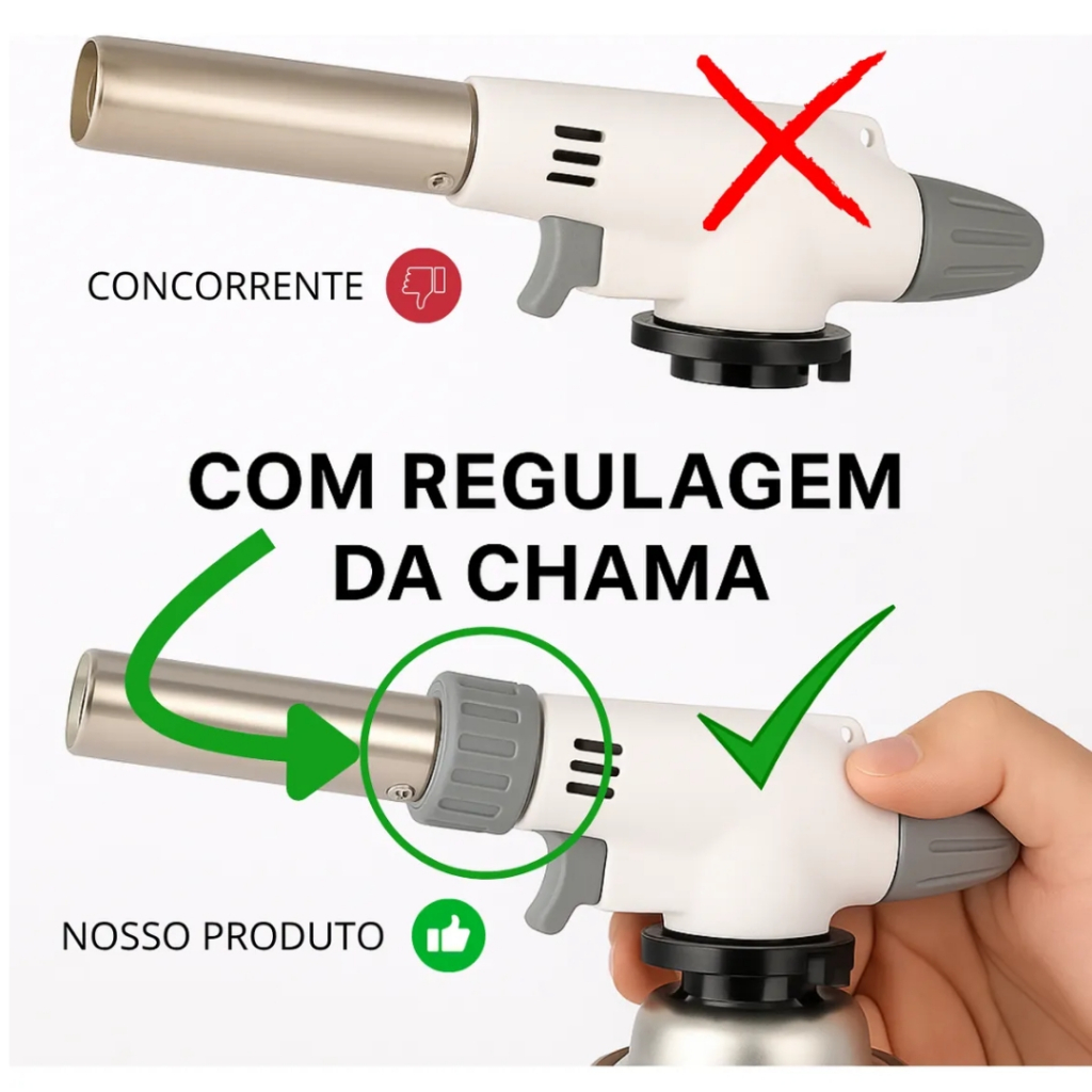 Maçarico Culinário Gourmet Profissional Regulável Portátil Maçarico Culinário Profissional – Potência e Precisão para Suas Receitas O Maçarico Culinário Gourmet Profissional Regulável é ideal para chefs, confeiteiros e entusiastas da gastronomia. Com ajuste de chama e temperatura de até 1300C, ele garante um acabamento perfeito em pratos sofisticados, como crème brûlée, carnes seladas e defumação de alimentos. Potência e Controle Total Ajuste preciso da chama para diferentes aplicações. Alta Qualidade e Segurança Construído com materiais resistentes ao calor, garantindo durabilidade e desempenho superior. Fácil Abastecimento Compatível com refis de gás butano mais comuns do mercado. Portátil e Versátil Ideal para uso culinário, acendimento de churrasqueiras, artesanato e pequenas soldagens. Acendimento Automático Dispensa fósforos e isqueiros, oferecendo praticidade e segurança. Qualquer dúvida estamos a disposição!