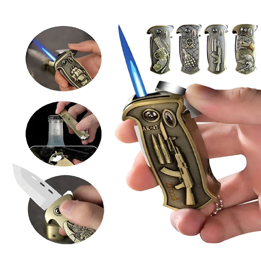Maçarico Isqueiro Canivete 4 em 1 com Abridor e Chaveiro Isqueiro enviado com temas sortidos e sem gás
