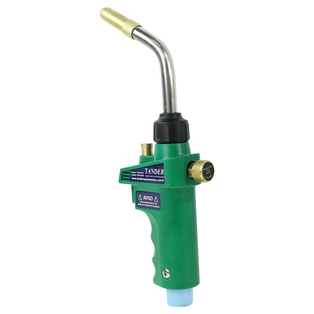 Maçarico Portátil Gás Automático 2200ºc - TMP2200R Tander é ideal quem trabalha com metal, plástico, refrigeração e outros tipos. Prático, leve, seguro e resistente, ele lhe garante mais qualidade em seus serviços. :Maçarico de alta eficiência e baixo consumo :Próprio para gás MAPP e Propileno :Acendimento Automático :Chama espiralada :Bico com giro de 360° :Trava de segurança contra acionamento acidental :Regulador de gás manual Tipo de gás recomendado: MAPP, Propileno Método de acionamento: Gatilho Manual *Não acompanha refil de gás