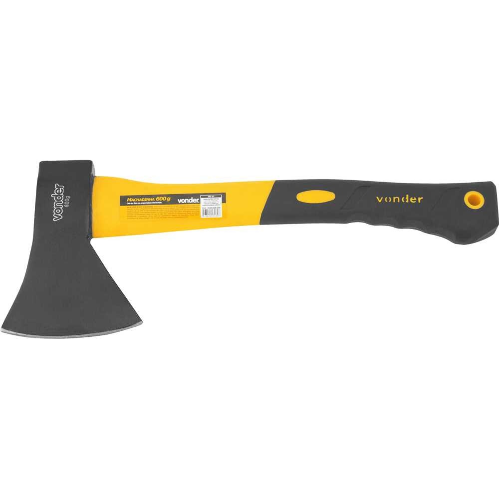 Machadinha Com Cabo De Fibra 600 G Vonder Cabo de fibra com empunhadura emborrachada, proporcionando maior resistência e conforto no manuseio. Indicada para diversas atividades, desde o corte de lenha até a construção civil e jardinagem. Material da lâmina: aço carbono SAE 1040. Especificações Técnicas: Tipo da machadinha: Sem unha Material (tipo/composição): Aço carbono SAE 1040 Comprimento da lâmina: 105,0 mm Comprimento total da machadinha: 360,0 mm Acabamento: Pintado Cabo: Fibra Emborrachado Massa aproximada (peso) (kg): 0.915 kg Conteúdo da Embalagem: 1 Machadinha.