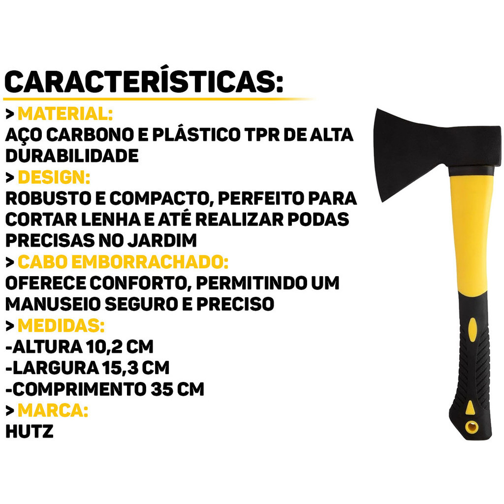 Machado Com Cabo Emborrachado Hutz Sabemos que encontrar um machado resistente e confortável pode ser desafiador. O Machado Hutz resolve esse problema ao combinar um cabo emborrachado ergonômico com uma lâmina de aço afiada, proporcionando conforto e eficiência. O cabo emborrachado do machado oferece uma aderência confortável, permitindo que você use a ferramenta por horas sem desconforto. É ideal para atividades no camping, jardinagem e preparação de lenha. Características: > Resistente e durável; > O cabo é produzido em aço carbono emborrachado e plástico TPR; > Possui um equilíbrio perfeito entre o peso da cabeça e do cabo, tornando-o fácil de manusear e controlar. Especificações Técnicas: > Material: aço e plástico TPR; > Dimensões do produto (C x L x A): 35cm x 15,3cm x 10,2cm. - Marca: Hutz - Garantia: 90 dias contra defeitos de fabricação Vantagens de comprar na Brester: - Produto a pronta entrega. - Produto novo, com garantia de fábrica. - Nota fiscal para Pessoa Física e Pessoa Jurídica.