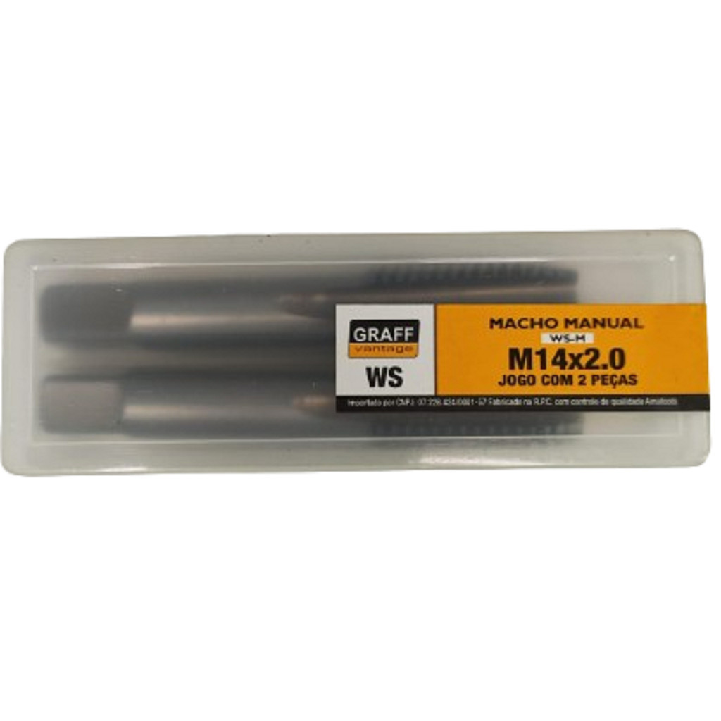 Os Machos são ferramentas utilizadas para a criação de roscas e possibilitam a usinagem de peças e acessórios altamente profissionais. Medidas: - Bitola: M14 - Passo: 2.0 - Comprimento Total (mm): 70 - Comprimento Rosca (mm): 24 - Diâmetro Haste (mm): 11mm - Quadrado (mm): 9 - Diâmetro Broca (mm): 12,5 Especificações: - Rosca Métrica Grossa M – DIN 352 - Material: Aço Liga WS; - Jogo Com 2 Peças; - Marca:Graff Do Grupo ROCAST. Aplicação: - Possuem diâmetros diferentes entre as peças que permite uma distribuição equilibrada de torque, retirada de cavaco e desgaste das peças, conferindo ao jogo uma maior vida útil; - Para materiais de difícil usinagem e para um melhor acabamento.