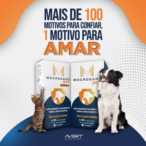 Macrogard Pet Small Size 30 Comprimidos - Avert ............................................. - EMBALAGENS SEGURAS - PRODUTOS ORIGINAIS - ACOMPANHA NOTA FISCAL - TIRE DÚVIDAS CONOSCO VIA CHAT ........................................ DETALHES: - Suplemento com betaglucanas; - Palatável com aroma de bacon; - Imunomodelador: aumento da imunidade; - O único com Macrogard, a melhor betaglucana do mundo. O Suplemento Alimentar Avert Macrogard Pet Small Size para Cães e Gatos é composto por betaglucanas (beta-1,3/1,6 glucanas) purificadas da levedura Saccharomyces cerevisae, um importante aditivo prébiótico agindo principalmente como imunomodulador, anti-inflamatório e hipoglicêmico. Além disso, a betaglucana pode auxiliar em processos cancerígenos (ação antimutagênico e antitumoral). É o único com Macrogard, a melhor e mais estudada betaglucana do mundo. ................................................. DICAS: MODO DE USAR: A suplementação dos pets deve ser feita sempre sob orientação e recomendação do médico veterinário. Nunca suplemente o pet sem necessidade, o excesso de vitaminas e minerais pode ser tão prejudicial quanto a falta deles. A indicação é 1 comprimido a cada 12 Kg de peso por dia ou de acordo com a recomendação do médico veterinário. .........................................................