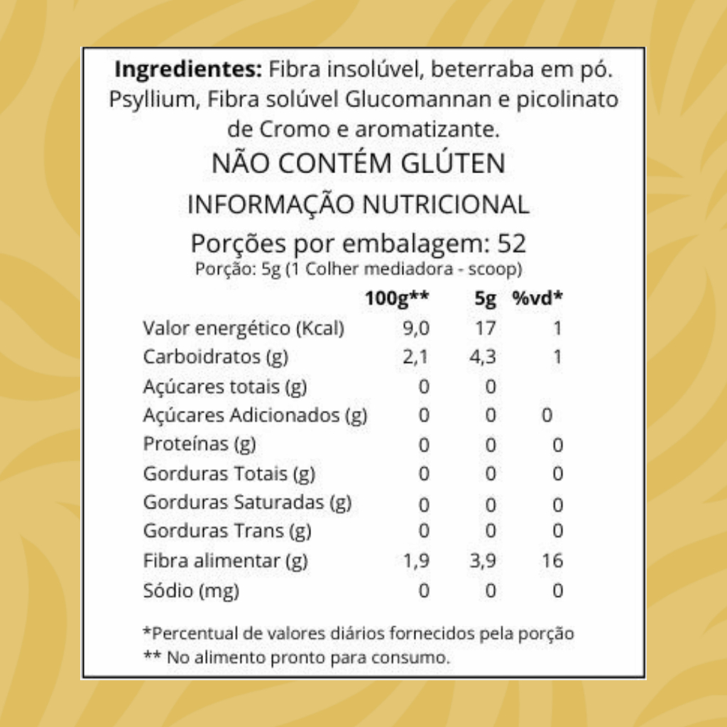 Ingredientes Psyllium Lotus (fonte de fibra solúvel) Raiz de Konjac Manã Picolinato de cromo Como Usar Modo de uso: 5 g (2 scoops) 10 minutos antes das principais refeições, diluídos em 150 a 200 ml de água Duração: 26 dias usando 10 g por dia Dicas Extras para Potencializar Consuma bastante líquido ao longo do dia para potencializar os efeitos das fibras. Informações Importantes Suplemento alimentar - não é medicamento. Não previne, trata ou cura doenças. Resultados variam conforme hábitos dietéticos, hidratação, rotina de sono e atividade física. Conservar em local fresco, seco e ao abrigo da luz. Respeite a validade indicada no rótulo. Consuma em até 60 dias após abertura. Manter fora do alcance de crianças. Pessoas com condições de saúde, gestantes, nutrizes ou em uso de medicamentos devem buscar orientação profissional antes do uso.
