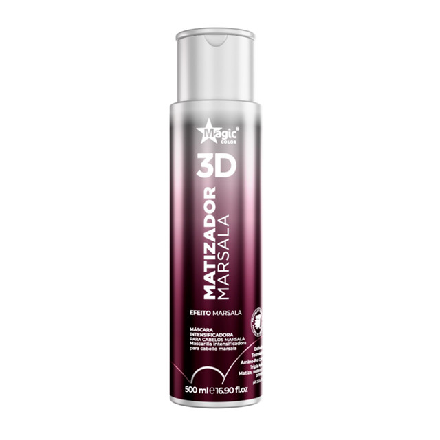 Matizador 3D Marsala - Efeito Marsala A Magic Color, referência em matizadores, acredita que cabelo e cores são únicos. Portanto, desenvolvemos matizadores para a manutenção personalizada que enaltece o melhor de cada cabelo. As Máscaras Matizadoras 3D contêm exclusiva tecnologia Amino-Pro Color, um complexo de aminoácidos e proteínas com sistema TRIPLA AÇÃO: matiza, restaura e protege. O Matizador 3D Marsala realça a cor do cabelo marsala, não é coloração e nem tonalizante. O Matizador 3D Marsala é uma Máscara capilar pigmentada com a função de intensificar e revitalizar a cor do cabelo vermelho que, com o passar do tempo, desbota e perde a vitalidade. Amino-Pro Color: repõe aminoácidos e proteínas reforçando sua estrutura, repara o fio danificado e quebradiço, atua como protetor térmico e filtro UV vegetal*. REALIZE TESTE DE MECHA antes da aplicação. Modo de uso: Após lavar os cabelos com shampoo, aplique o matizador puro ou misturado em máscara branca. Sugestão: 1 medida de matizador para 2 medidas de máscara branca. Aplique mecha a mecha. Deixe agir entre 15 min a 30min. Enxágue. Para efeitos mais suaves, aumentar a diluição do produto. Precauções: Uso adulto externo. Evite contato com os olhos. Em caso de irritação, suspenda o uso. Evite calor excessivo e mantenha fora do alcance de crianças e animais domésticos.