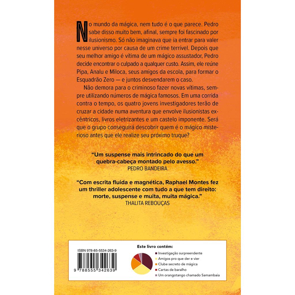 A cada truque de mágica, um crime. Em seu primeiro livro juvenil, o mestre do suspense Raphael Montes nos apresenta ao Esquadrão Zero ― um grupo de jovens detetives que vai encarar uma investigação repleta de perigos e reviravoltas. No mundo da mágica, nem tudo é o que parece. Pedro sabe disso muito bem, afinal, sempre foi fascinado por ilusionismo. Só não imaginava que ia entrar para valer nesse universo por causa de um crime terrível. Depois que seu melhor amigo é vítima de um mágico sinistro, Pedro decide encontrar o culpado a qualquer custo. Assim, o garoto reúne Pipa, Analu e Miloca, seus amigos de escola, para formar o Esquadrão Zero ― e juntos desvendarem o caso.Não demora para o criminoso fazer novas vítimas, sempre utilizando números de mágica famosos. Em uma corrida contra o tempo, os quatro jovens investigadores terão de cruzar a cidade numa aventura que envolve ilusionistas excêntricos, livros eletrizantes e um castelo imponente. Será que o grupo conseguirá descobrir quem é o mágico assustador antes que ele realize seu próximo truque? Indicado para leitores a partir de 10 anos. “Um suspense mais intrincado do que um quebra-cabeça montado pelo avesso.” ― Pedro Bandeira “Com escrita fluida e magnética, Raphael Montes fez um thriller adolescente com tudo a que tem direito: morte, suspense e muita, muita mágica.” ― Thalita Rebouças