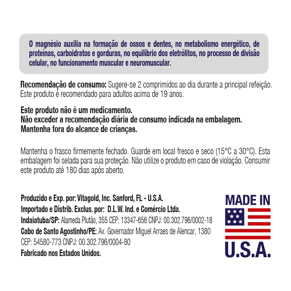 Suplemento alimentar de Magnésio Dimalato em 60 comprimidos O magnésio auxilia na formação de ossos e dentes. O magnésio auxilia no metabolismo energético. O magnésio auxilia no metabolismo de proteínas, carboidratos e gorduras. O magnésio auxilia no equilíbrio dos eletrólitos. O magnésio auxilia no funcionamento muscular. O magnésio auxilia no funcionamento neuromuscular. O magnésio auxilia no processo de divisão celular. Recomendação de consumo: Sugere-se 2 comprimidos ao dia durante a principal refeição do indivíduo. Apresentação: 60 comprimidos. Produto isento da Obrigatoriedade de Registro conforme RDC nº240/18. Fabricado nos Estados Unidos.