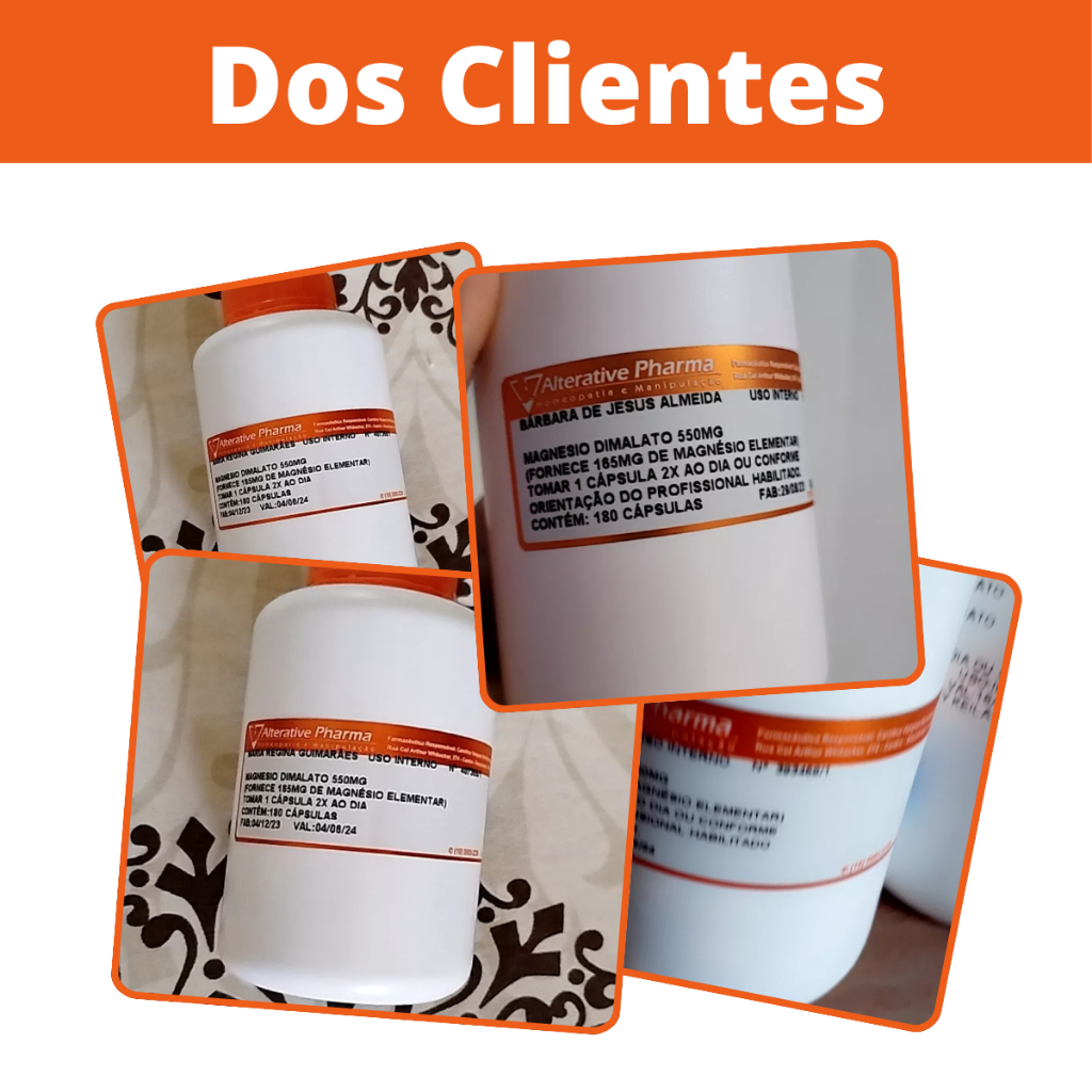 COMPOSIÇÃO: Magnésio Dimalato 550mg (Fornece 165mg de Magnésio Elementar) Excipiente qsp 1 cápsula SUGESTÃO DE USO: Tomar 1 cápsula duas vezes ao dia ou conforme orientação do profissional habilitado. VALIDADE: 06 meses a partir da data de manipulação. Sobre a Empresa Há mais de 30 anos, a Alterative Pharma consolidou-se como sua escolha confiável em farmácia de manipulação, oferecendo soluções personalizadas para suas necessidades de saúde e bem-estar. Nossa equipe de especialistas em manipulação farmacêutica garante a qualidade e eficácia dos suplementos, empregando os melhores ingredientes e tecnologia de ponta. Estamos comprometidos em fornecer cuidados de saúde personalizados e seguros. Confie em nós para cuidar da sua saúde de forma individualizada e confiável. CNPJ: 60.707.635/000155 Farmacêutica Responsável: Carolina V. B. Reschini CRF-SP: 38.309
