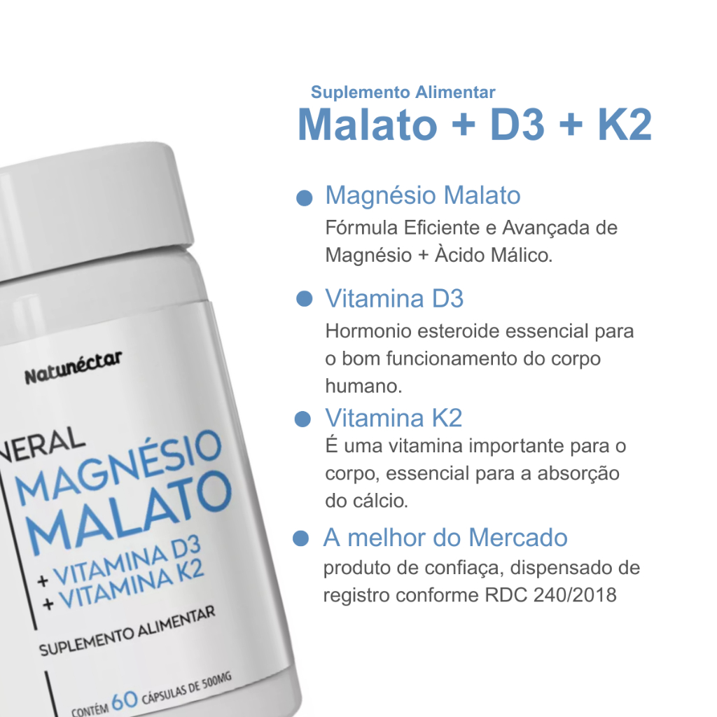Magnésio Malato Vitaminas D3 + K2 Suplemento Natural 60 Cáps Puro Original Concentrado Natunéctar