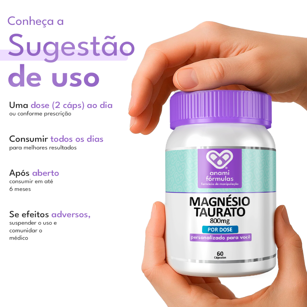 O Magnésio Taurato da Anami é um suplemento de alta pureza que une dois elementos fundamentais: o magnésio, essencial para mais de 300 funções bioquímicas no organismo, e a taurina, um aminoácido que potencializa sua absorção e atuação especialmente no sistema nervoso e cardiovascular. Essa forma de magnésio é reconhecida por sua alta biodisponibilidade e excelente tolerância gastrointestinal. Benefícios principais: Contribui para o equilíbrio neurológico e melhora do foco mental Auxilia no relaxamento muscular e redução de câimbras Suporte à função cardíaca e pressão arterial saudável Redução do estresse e melhora do sono Absorção superior e leve para o estômago Composição por dose (2 cápsulas): Magnésio Taurato: 800mg Cápsulas vegetais e excipientes seguros Produto 100% puro – sem aditivos artificiais Sugestão de uso: Ingerir 2 cápsulas ao dia, preferencialmente antes das refeições, ou conforme orientação profissional. Indicado para: Adultos a partir de 18 anos. Ideal para quem busca suporte neurológico, muscular e cardiovascular de forma segura e natural. FAQ – Perguntas Frequentes 1. O produto é de origem vegetal? Sim, as cápsulas são vegetais. O magnésio taurato é livre de componentes animais. 2. Tem efeito colateral? Quando usado conforme orientado, é bem tolerado. Não causa desconfortos gastrointestinais comuns a outras formas de magnésio. 3. Pode ser combinado com outros suplementos? Sim, é seguro com vitaminas, minerais e outros compostos, mas sempre consulte um profissional. 4. Tem glúten ou lactose? Não. Produto livre de glúten, lactose e corantes artificiais.