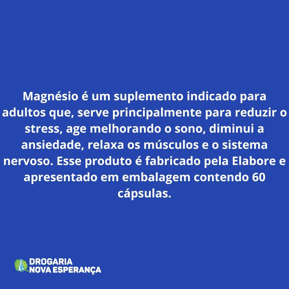 Magnésio 5 Elabore para que serve: - Suplemento com minerais que reduzem o stress, melhoram o sono, diminuem a ansiedade e relaxa os músculos e o sistema nervoso.