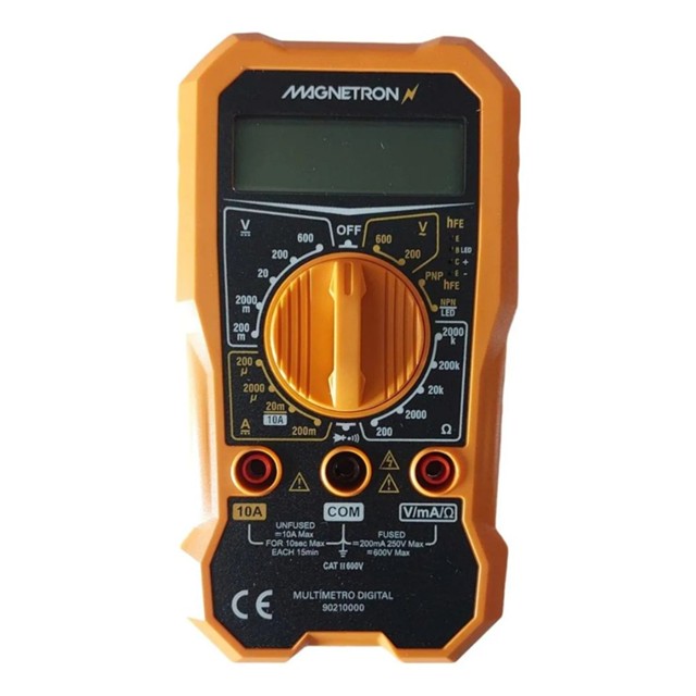 Multímetro Digital Magnetron - Precisão Profissional 10A-600V Display LCD de 3 ½ dígitos, que realiza medidas de tensão AC e DC, corrente DC, resistência, continuidade, teste de diodo e transistor hFE. --------------------------------------------------------------------------- Especificações Técnicas: - Faixa de Medição: 0-10A (Corrente), 0-600V (Tensão) - Precisão: ±0.5% para medições de tensão; ±1.0% para medições de corrente - Display: LCD de alta visibilidade com iluminação de fundo - Funções Adicionais: Medição de resistência, teste de diodo, continuidade com sinal sonoro - Precisão Incomparável: Ideal para todos os tipos de trabalhos elétricos, garantindo leituras exatas.