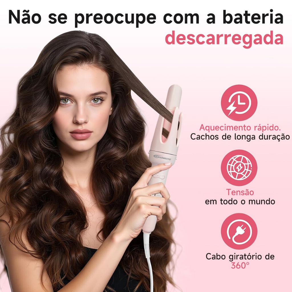 Bem-vindo(a) à nossa loja. Boas compras! Siga a loja para receber cupons exclusivos! Desejamos-lhe boas compras e esperamos receber sua avaliação de cinco estrelas! 【MAIMEITE】A MAIMEITE está empenhada em fornecer produtos de qualidade para jovens. 【Envio rápido】 Desfrute de um serviço rápido e de alta qualidade. 【Garantia de qualidade】100% novo e autêntico. 【Serviço pós-venda eficiente】Se encontrar algum problema com o produto, entre em contato conosco pelo chat e resolveremos o problema para você. ------------------------------------------------ Todas as soluções para penteados em uma única ferramenta! Principais Características 4 Funções em 1 Ferramenta 3 Tamanhos de Bobes para Cachos: - 38mm: Bobes grandes para volume máximo (estilo "ondas de praia"). - 32mm: Bobes médios para cachos naturais e estilosos. - 25mm: Bobes pequenos para cachos definidos e românticos. Voltagem: 110-240 V - Pente Alisador: Alise o frizz em uma única passada! Tecnologia Avançada: - Garras Rotativas Flexíveis Tração automática do cabelo, aquecimento uniforme, cachos mais elásticos e naturais! - Dentes Grossos Anti-Queimaduras Design seguro para o couro cabeludo, prevenindo queimaduras durante o uso. - Aquecedor PTC Inteligente: Temperatura constante, cabelo protegido contra danos! (Teste de laboratório: aquece 60% mais rápido que ferramentas tradicionais). - - 3 Modos de Temperatura Inteligentes - Temporizador Automático + Sinal Sonoro Defina o tempo de modelagem (6s/9s/12s) - Design Seguro e Ergonômico - **Cabo Antiescaldante: Confortável de segurar, não queima a mão. - Cabo Giratório 360°: Movimento livre, sem emaranhados! - Dentes Curvos Protetores: Cobertura completa, seguro para iniciantes!