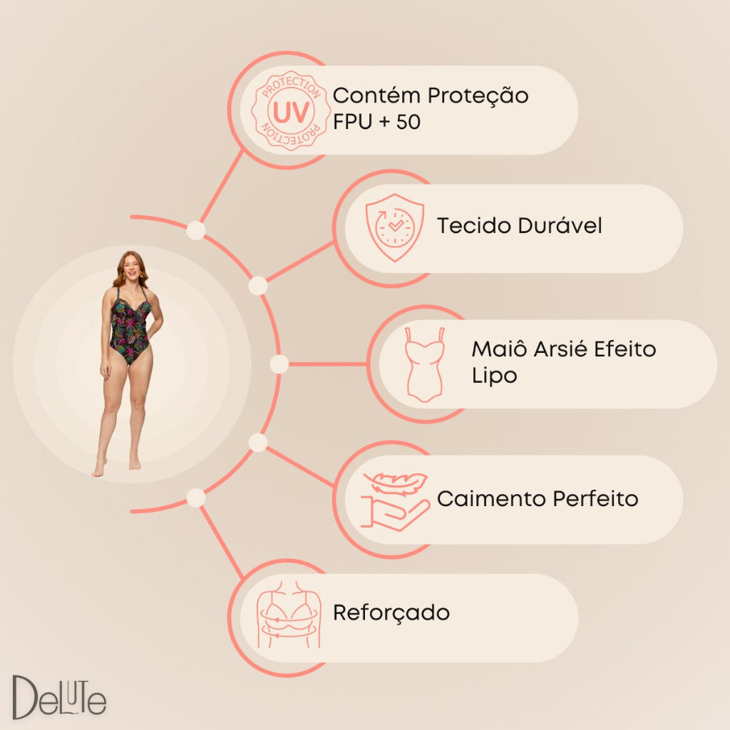 Maiô Arsiè com Bojo de Leve Compressão Modela e Valoriza a Silhueta Alça Fina e Ajustável FPU 50+