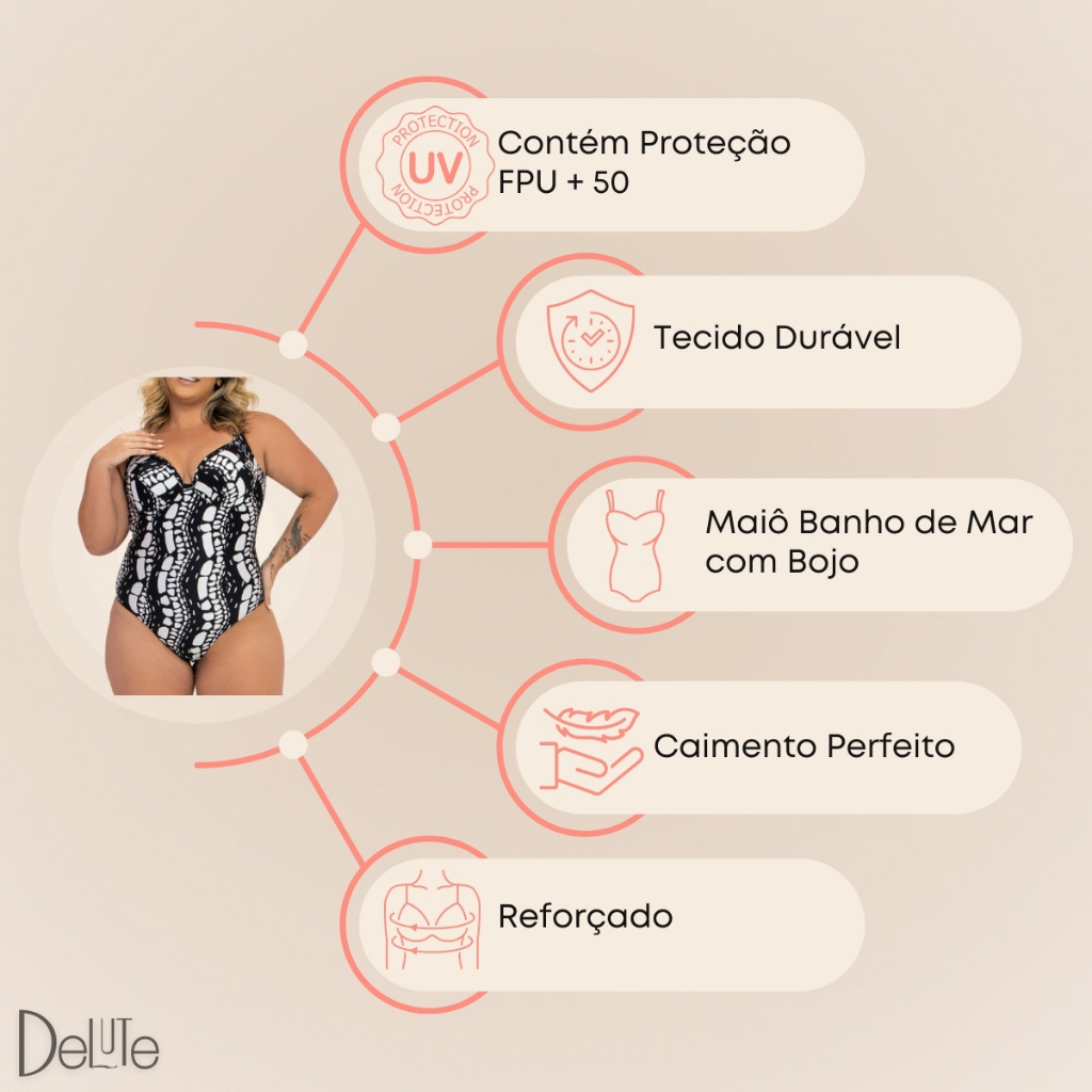 Maiô Banho de Mar com Bojo e Trança Estampado Ref: BM623510 Os Maiôs com Bojo Zero Barriga ajudam a criar uma silhueta mais esbelta e um contorno corporal harmonioso, protegendo suas curvas e sua pele com tecido de alta tecnologia que absorve raios ultravioleta (UV). Todos os produtos possuem fator de proteção ultravioleta (FPU) 50+, bloqueando 98% dos raios UV, e são feitos com a qualidade da etiqueta XTRA LIFE, desenvolvida para tecidos de moda praia que resiste dez vezes mais ao cloro, óleos bronzeadores e protetores solares. - Molda-se perfeitamente ao busto, mesmo em tamanhos maiores. - Bojo com a profundidade ideal. - Tecido de secagem rápida. Composição: Tecido: Poliamida 86% Elastano 14% Forro: Poliamida 91% Elastano 9% Enchimento: Poliuretano 100% Forro do Bojo: Poliéster 100%
