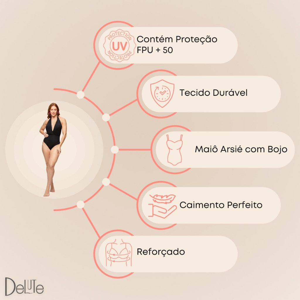 Maiô Body com Bojo Decote V Arsiè Ref: AS5134 Descubra o maiô ideal para suas aventuras na praia com o Maiô Arsiè, que une elegância e praticidade, assegurando conforto e segurança. As alças de amarrar proporcionam um encaixe perfeito, garantindo conforto e apoio. O modelo tanga valoriza as curvas do corpo com finesse, enquanto a proteção UV 50+ cuida da sua pele contra os raios solares prejudiciais, assegurando diversão ao sol com segurança. Com um ajuste impecável, foi desenhado para se moldar perfeitamente ao corpo, promovendo liberdade de movimento e conforto. Para um dia sereno na praia ou para um refrescante mergulho na piscina, o Maiô Arsiè é a escolha perfeita para quem valoriza estilo, conforto e proteção. - Proporciona um encaixe perfeito ao corpo. - Alças ajustáveis. - Com bojo. - Costas nua. Composição: Tecido: Poliéster 85% Forro: Poliéster 95%