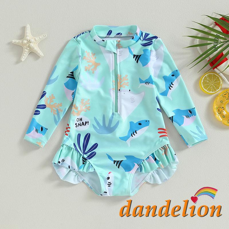 Maiô de Uma Peça para Meninas de 9 Meses a 5 Anos com Manga Longa e Gola Alta, Estampa de Animais Marinhos, Roupas de Banho para o Verão na Praia.