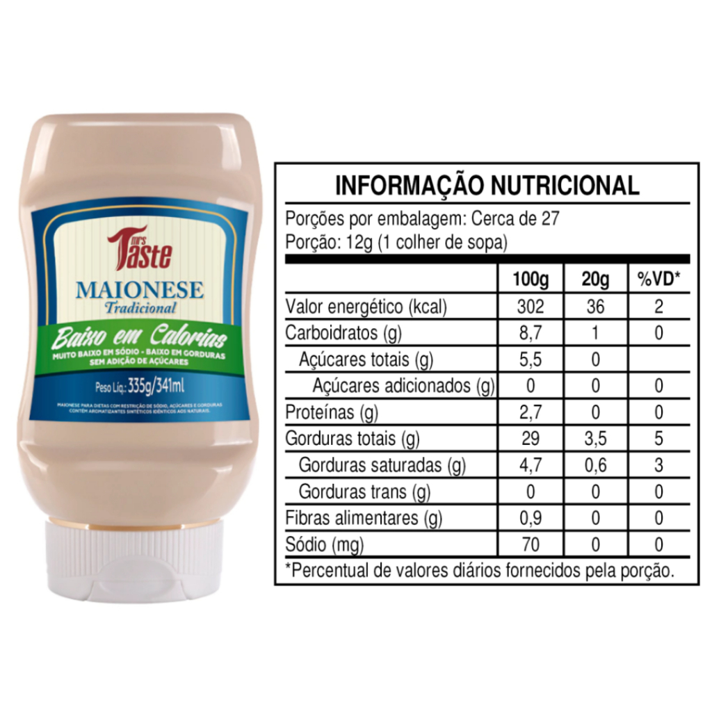 O molho que faltava para completar o trio Mrs Taste chegou! A Maionese Mrs Taste é BAIXO sódio, muito BAIXO calorias e ZERO açúcar, trazendo o sabor tradicional da maionese, com o benefício de comer sem culpa. Com azeite extra virgem em sua composição, que substitui o comum óleo de soja utilizado na maioria das composições, e em quantidade bem menor. Também utilizam clara de ovo, poupando assim as calorias e colesterol que estão inclusos na gema do ovo. Ingredientes: Água, vinagre, amido de batata modificado, clara de ovo pasteurizada em pó, azeite de oliva extra virgem, cloreto de potássio, cebola, molho de mostarda Mrs Taste, alho, aromatizantes, espessante goma xantana, conservadores sorbato de potássio e benzoato de sódio, acidulante ácido cítrico e edulcorante sucralose. NÃO CONTÉM GLÚTEN. ALÉRGICOS: CONTÉM DERIVADOS DE OVOS. -------------------------------------------------------- Mudança na rotulagem nutricional -------------------------------------------------------- Informamos que passamos recentemente por uma mudança na rotulagem nutricional nos produtos da Mrs. Taste devido às novas legislações RDC Nº 429/20 e IN Nº75/20 da ANVISA. Portanto, os lotes mais recentes estão com diferentes caracterizações