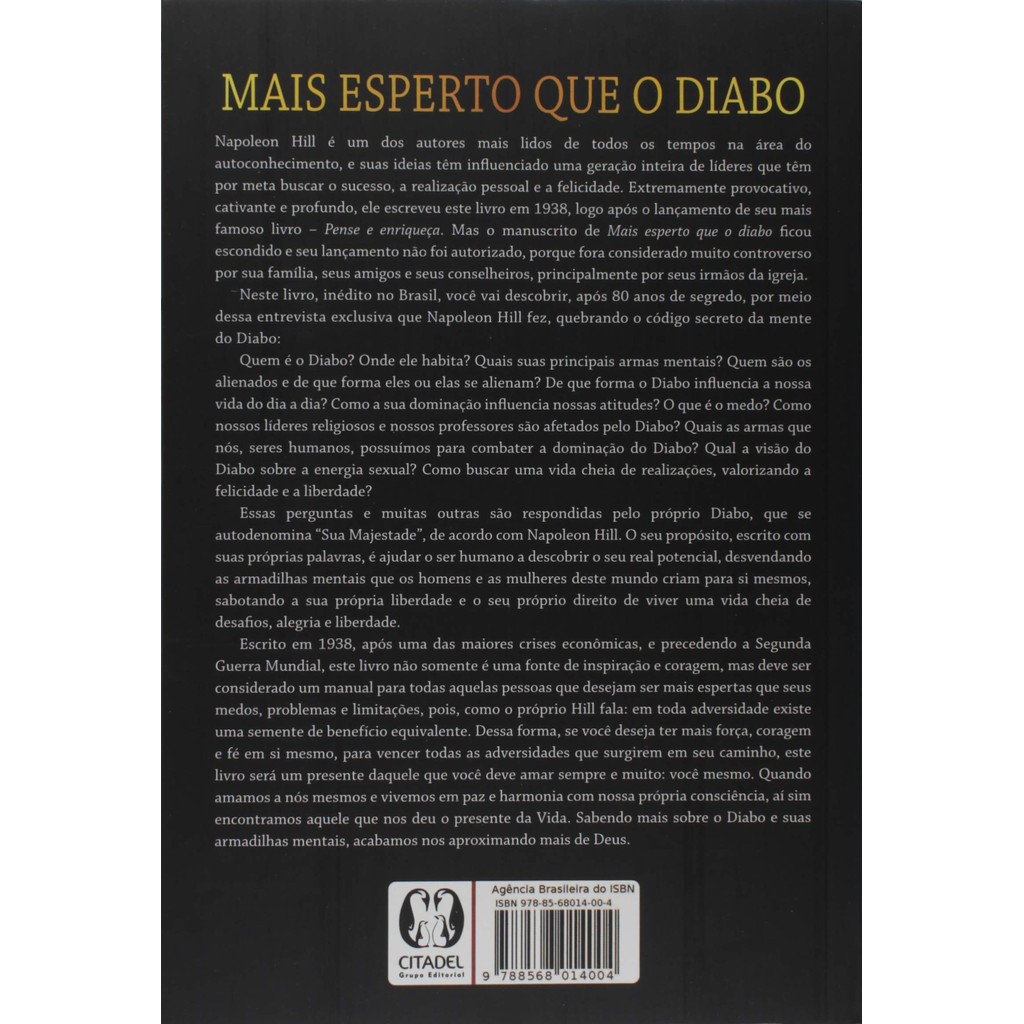 Neste livro, inédito no Brasil, você vai descobrir, após 75 anos de segredo, por meio dessa entrevista exclusiva que Napoleon Hill fez, quebrando o código secreto da mente do Diabo: Quem é o Diabo? Onde ele habita? Quais suas principais armas mentais? Quem são os alienados e de que forma eles ou elas se alienam? De que forma o Diabo influencia a nossa vida do dia a dia? Como a sua dominação influencia nossas atitudes? O que é o medo? Como nossos líderes religiosos e nossos professores são afetados pelo Diabo? Quais as armas que nós, seres humanos, possuímos para combater a dominação do Diabo? Qual a visão do Diabo sobre a energia sexual? Como buscar uma vida cheia de realizações, valorizando a felicidade e a liberdade? Essas perguntas e muitas outras são respondidas pelo próprio Diabo, que se autodenomina "Sua Majestade", de acordo com Napoleon Hill. O seu propósito, escrito com suas próprias palavras, é ajudar o ser humano a descobrir o seu real potencial, desvendando as armadilhas mentais que os homens e as mulheres deste mundo criam para si mesmos, sabotando a sua própria liberdade e o seu próprio direito de viver uma vida cheia de desafios, alegria e liberdade. Escrito em 1938, após uma das maiores crises econômicas, e precedendo a Segunda Guerra Mundial, este livro não somente é uma fonte de inspiração e coragem, mas deve ser considerado um manual para todas aquelas pessoas que desejam