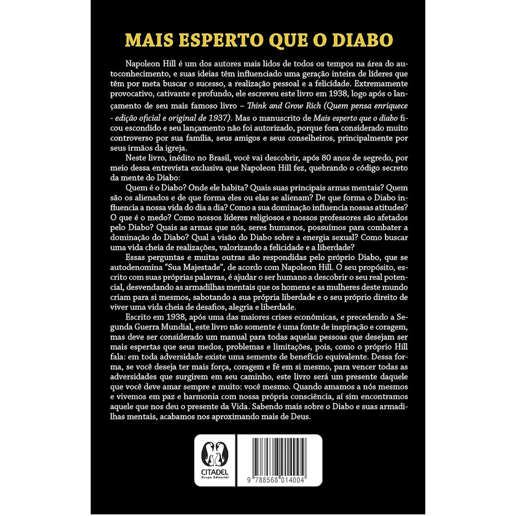 O maior sucesso da Citadel Editora é o primeiro título da coleção Diamante de Bolso, que reúne obras de nosso catálogo em versão concisa e editada, para você carregar consigo como uma autêntica pedra preciosa, tendo ao alcance de sua mão uma fonte de inspiração e iluminação. Neste livro, inédito no Brasil, você vai descobrir, após 80 anos de segredo, por meio desta entrevista exclusiva que Hill fez, quebrando o código secreto da mente do Diabo: Quem é o Diabo? Onde ele habita? Quais suas principais armas e artimanhas mentais? Quem são os alienados e de que forma se alienam? Qual a visão do Diabo sobre a energia sexual? Como buscar uma vida cheia de realizações, valorizando a felicidade e a liberdade? Escondido desde 1938, este livro não somente é uma fonte de inspiração e coragem, mas também deve ser considerado um manual para todas aquelas pessoas que desejam ser mais espertas que seus medos, problemas e limitações. Sabendo mais sobre o Diabo e suas armadilhas mentais, acabamos nos aproximando mais do Criador. 13x11 cm 144 Páginas