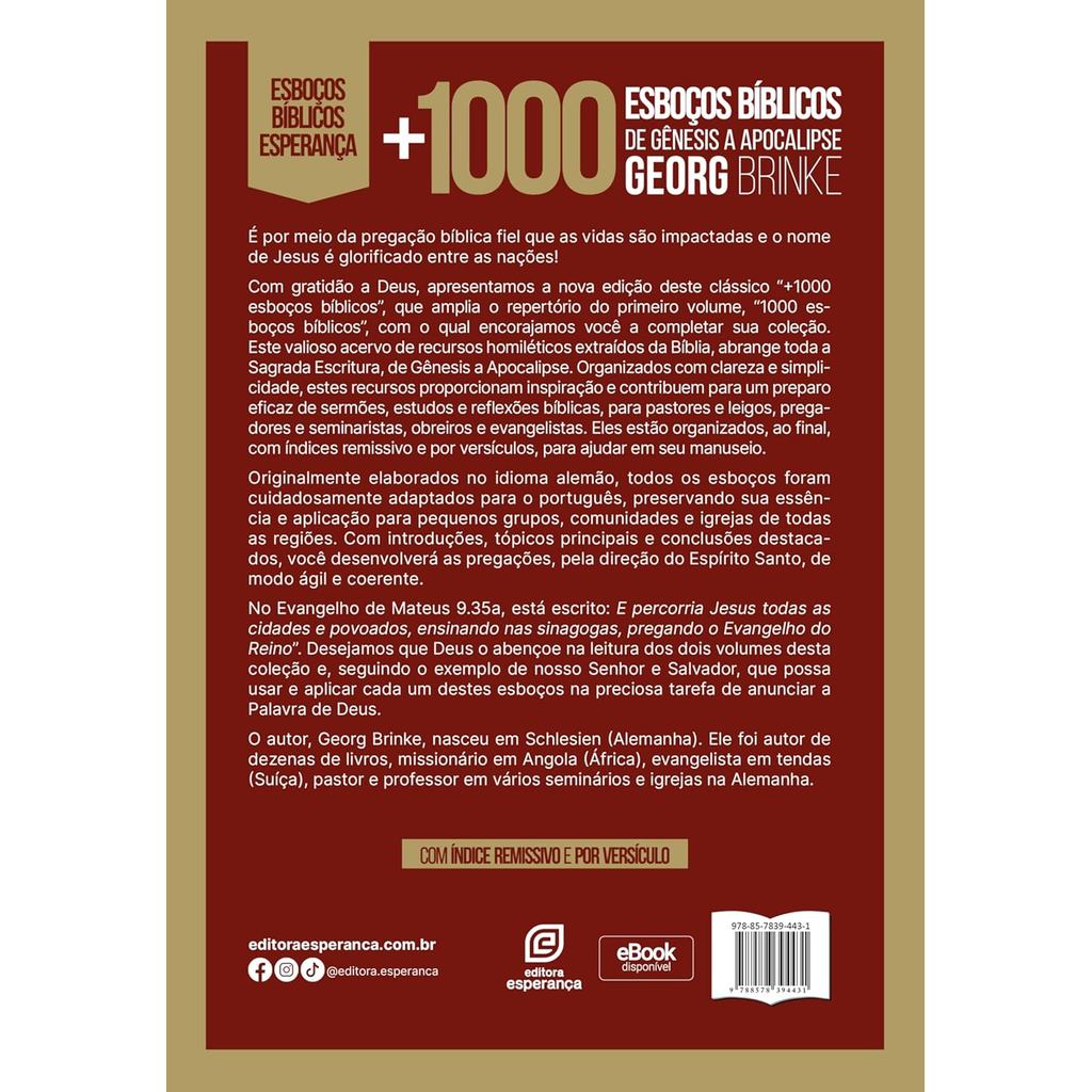 É por meio da pregação bíblica fiel que as vidas são impactadas e o nome de Jesus é glorificado entre as nações!Com gratidão a Deus, apresentamos a nova edição deste clássico “+1000 esboços bíblicos”, que amplia o repertório do primeiro volume, “1000 esboços bíblicos”, com o qual encorajamos você a completar sua coleção.Este valioso acervo de recursos homiléticos extraídos da Bíblia, abrange toda a Sagrada Escritura, de Gênesis a Apocalipse. Organizados com clareza e simplicidade, estes recursos proporcionam inspiração e contribuem para um preparo eficaz de sermões, estudos e reflexões bíblicas, para pastores e leigos, pregadores e seminaristas, obreiros e evangelistas. Eles estão organizados, ao final, com índices remissivo e por versículos, para ajudar em seu manuseio.Originalmente elaborados no idioma alemão, todos os esboços foram cuidadosamente adaptados para o português, preservando sua essência e aplicação para pequenos grupos, comunidades e igrejas de todas as regiões. Com introduções, tópicos principais e conclusões destacados, você desenvolverá as pregações, pela direção do Espírito Santo, de modo ágil e coerente.No Evangelho de Mateus 9.35a, está escrito: E percorria Jesus todas as cidades e povoados, ensinando nas sinagogas, pregando o Evangelho do Reino”. Desejamos que Deus o abençoe na leitura dos dois volumes desta coleção e, seguindo o exemplo de nosso Senhor e Salvador, que possa usar e aplicar cada um destes esboços na preciosa tarefa de anunciar a Palavra de Deus. 16x23cm 320 Páginas
