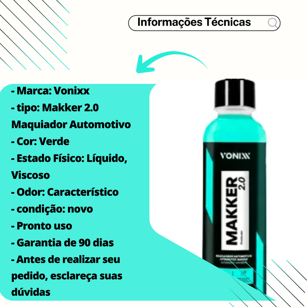 🚗✨ Makker 2.0 Maquiador Automotivo Vonixx – 240ml Bem-vindo! Você está em uma loja especializada em soluções automotivas seguras e confiáveis. Aqui, cada detalhe é pensado para cuidar do que move você: sua família, sua segurança e seus melhores momentos na estrada. 🧴 Sobre o Produto MAKKER 2.0 é uma maquiagem automotiva desenvolvida exclusivamente para preencher pequenos defeitos, renovar pinturas queimadas ou desbotadas e alcançar brilho máximo na pintura. Além de maquiar, o produto proporciona toque extremamente liso e proteção por até 90 dias. 📝 Nota: Por conter microabrasivos especiais, também é capaz de corrigir defeitos leves quando utilizado com aplicador de microfibra ou máquina. 🔎 Referências Compatíveis 📌 37075 📌 1040008 📋 Informações do Produto 🏷️ Marca: Vonixx 🧪 Tipo: Makker 2.0 Maquiador Automotivo 🎨 Cor: Verde 💧 Estado físico: Líquido, viscoso 👃 Odor: Característico 📦 Condição: Novo ⚡ Pronto uso: Sim 🛡️ Garantia: 90 dias ❓ Antes de realizar seu pedido, esclareça suas dúvidas ✅ Aplicações Exclusivamente na pintura automotiva, para: ✨ Maquiar a pintura 🔧 Disfarçar pequenos defeitos superficiais 🔥 Renovar pinturas queimadas ou desbotadas 💎 Intensificar o brilho máximo 🚿 Aplicação após a lavagem do veículo 🚫 Onde NÃO Aplicar ❌ Verniz sensível ou repinturas recentes ❌ Couro natural ou sintético ❌ Tecidos, estofados e carpetes ❌ Plásticos delicados ou soft touch ❌ Superfícies aquecidas ❌ Vidros com película (insulfilm) ⭐ Benefícios 🔹 Remove riscos leves e imperfeições com segurança 🔹 Realça o brilho da lataria instantaneamente 🔹 Microabrasivos inteligentes que “maquiam” sem agredir 🔹 Fácil aplicação (manual ou com máquina) 🔹 Toque liso e acabamento profissional 🔹 Proteção por até 90 dias 🛠️ Modo de Uso 1️⃣ Agite bem o produto antes de usar 2️⃣ Aplique pequena quantidade em aplicador ou microfibra 3️⃣ Espalhe na pintura com movimentos uniformes e circulares 4️⃣ Aguarde secar por no mínimo 5 minutos 5️⃣ Remova o excesso com microfibra limpa até obter o brilho desejado 🏪 Compre com Segurança Adquira agora o Makker 2.0 Maquiador Automotivo Vonixx – 240ml em uma de nossas Lojas Oficiais: ✔️ Camillo Parts ✔️ Genuine Automotive ✔️ Edumac Parts Qualidade garantida, procedência confiável e suporte que você merece. ⚠️ Aviso Legal Proibimos o uso, cópia ou alteração de nossas fotos, imagens e conteúdos. Conforme a Lei 9.610/98, qualquer violação será tratada legalmente.