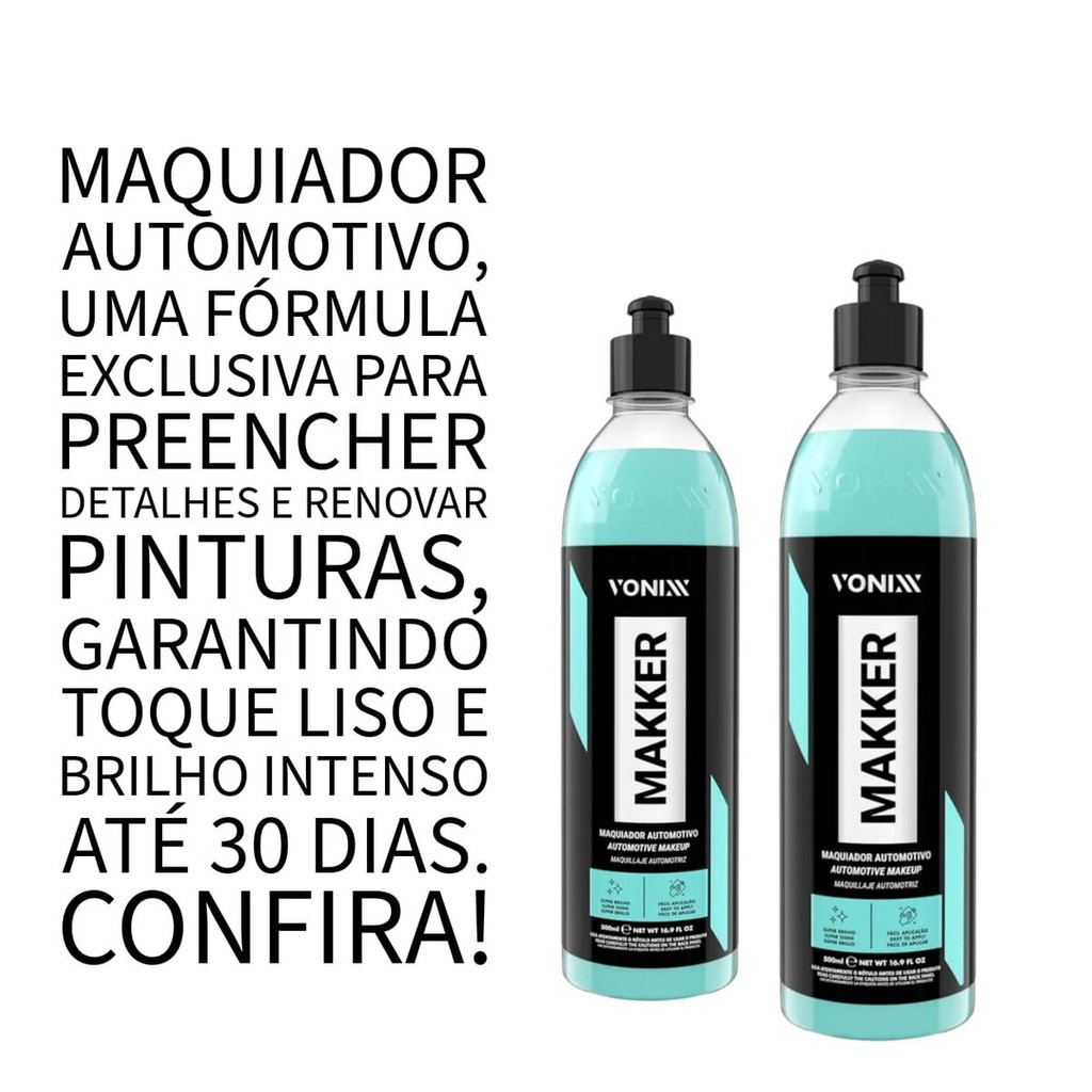 MAKKERMAQUIADOR AUTOMOTIVODESCRIÇÃOO Makker é um maquiador automotivo e chegou com o objetivo de trazer mais praticidade na hora de deixar o seu veículo com menos imperfeições. Sua fórmula foi desenvolvida exclusivamente para preencher pequenos defeitos e renovar pinturas, dando brilho máximo. Também contendo microabrasivos especiais, o produto é capaz de corrigir defeitos leves se utilizado com aplicador de microfibra ou máquina. Além de maquiar, o Makker deixa um toque liso e garante proteção de até 30 dias.DILUIÇÃOPronto uso.DURABILIDADEAté 30 dias após a aplicação.SUPER BRILHOFÁCIL APLICAÇÃODISPONÍVEL EM: 500ML
