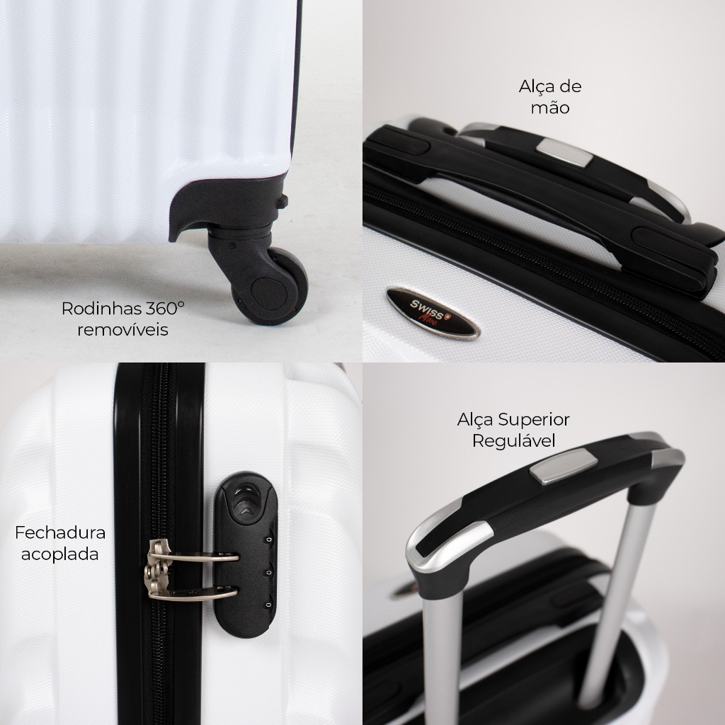 A Mala de bordo branca Dizy PP Swiss Move é ideal para ir com o passageiro na cabine do avião, isso porque, esse modelo atende as medidas desejadas pela ANAC (Agência Nacional de Aviação Civil). Produzidas em ABS, um material mais resistente, a mala de viagem de mão Dizy no tamanho PP tem medidas de 49 cm de altura, 30 cm de largura e 19 cm de profundidade, possui carrinho embutido regulável, alça superior e textura microdiamante. Na parte interior esse modelo é forrado em tecido poliéster, possui uma cinta elástica cruzada com trava e divisória em zíper para acomodar com segurança seus pertencem. Para facilitar esse modelo possui dispositivo que solta as rodas em um click. Clique em comprar e ganhe 3 meses de garantia pelo fabricante.