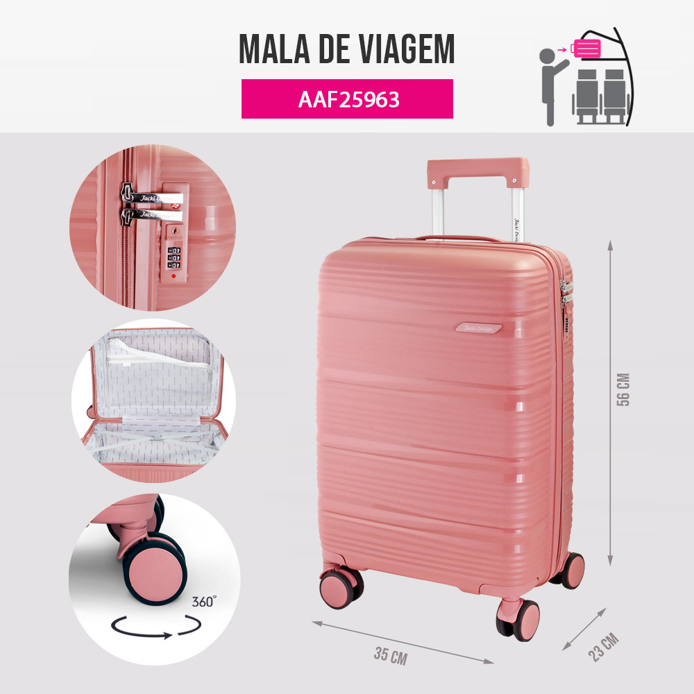 Mala de Bordo Essência – Rosa | Jacki Design Viaje com elegância, praticidade e segurança com a Mala de Bordo Essência da Jacki Design. Projetada dentro dos padrões aprovados pela ANAC, ela é ideal para ser levada como bagagem de mão em voos nacionais e internacionais, oferecendo o equilíbrio perfeito entre estilo, leveza e funcionalidade. Fabricada em material resistente de polipropileno, a mala garante durabilidade e proteção aos seus pertences, mesmo nas viagens mais longas. Seu design moderno e sofisticado se destaca, enquanto os detalhes funcionais tornam o transporte muito mais confortável e seguro. Com rodinhas duplas 360°, alça retrátil ajustável e trava de segurança embutida, a movimentação é fluida e prática em qualquer direção. O zíper duplo oferece mais resistência e o interior totalmente forrado, com compartimentos e elásticos organizadores, mantém tudo em ordem do embarque ao desembarque. Combine com a frasqueira da coleção Essência e monte um conjunto completo e harmonioso para suas viagens. Diferenciais: Aprovada para bordo (padrão ANAC) – ideal como bagagem de mão Rodinhas 360°, que garantem movimentação ágil e leve Trava de segurança embutida, protegendo seus pertences Zíper duplo reforçado, mais durabilidade e praticidade Alça retrátil e anatômica, com ajuste de altura Interior forrado, com divisórias e elástico organizador Design moderno e sofisticado, que combina com qualquer estilo Material leve e resistente, ideal para uso frequente Especificações: Material: Polipropileno Medidas: 35 cm (C) x 23 cm (P) x 56 cm (A) Marca: Jacki Design Limpeza e Cuidados: Parte Externa: Limpe com pano úmido, água morna e sabão neutro. Evite produtos abrasivos para preservar o acabamento. Parte Interna: Aspire ou remova resíduos com pano úmido e sabão neutro. Deixe secar completamente antes de fechar. Ideal para: Viagens de avião, dentro das normas da ANAC (bagagem de mão) Finais de semana, viagens curtas e corporativas Quem busca organização, leveza e design sofisticado