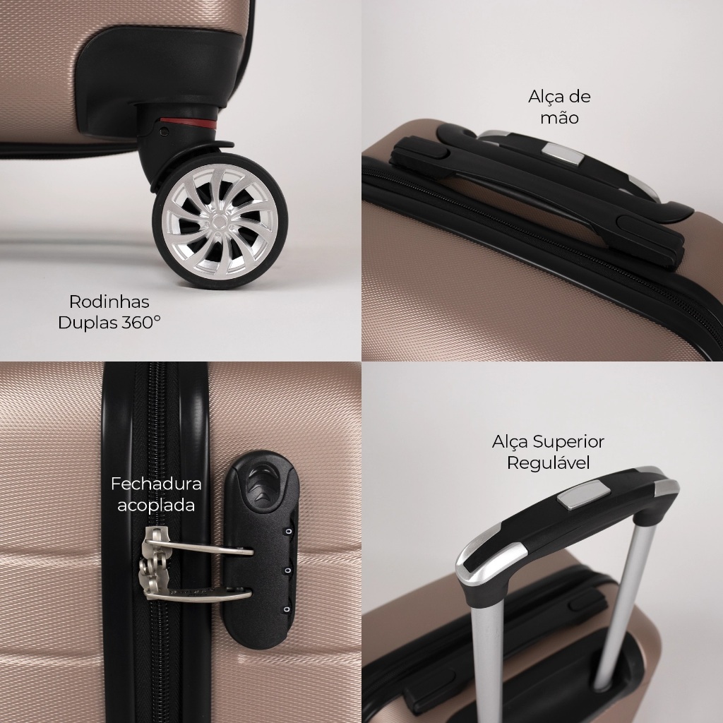 Compre a Mala de Bordo Pequena Tokio Swiss Move! Tamanho P, capacidade de 10kg e rodas dupla com giro em 360°. Esse modelo conta com alça telescópica com 3 posições, ou seja, permite que você adapte a alça às suas necessidades. Parte externa Estrutura rígida produzida em ABS 4 rodas que giram em 360º graus Carrinho externo com regulagem de altura Alça de mão (superior) Modelo impermeável Marca: Swiss Move Parte interna Cinta elástica cruzada para organizar seus pertences Bolso telado com zíper Forro personalizado Swiss Move Dimensões da mala de viagem incluindo as rodinhas Tamanho P: 54 cm de altura, 32 cm de largura e 21 cm de profundidade, peso 2,3 kg. Capacidade de 10kg, tamanho padrão ANAC para mala de bordo. Garantia de 90 dias pelo fabricante.