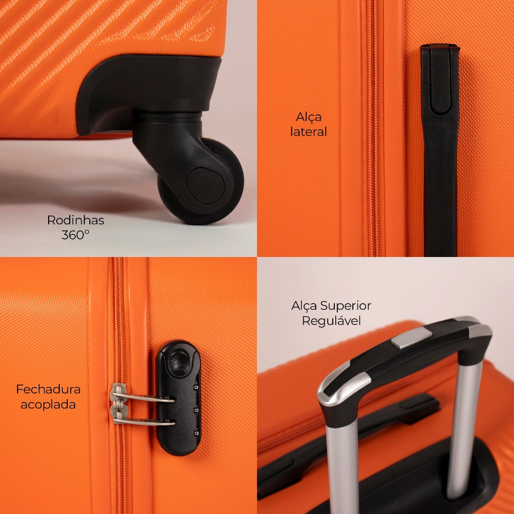 A mala grande Zug da Swiss Move é popular pela sua cor vibrante e estilo juvenil. A mala de viagem grande 32 kg oferece amplo espaço para acomodar todos os seus pertences, ideal para viagens mais longas. Equipadas com rodas 360°, permitindo que você desloque com facilidade em aeroportos e hotéis. Com design de listras e detalhes na mesma cor, a linha Zug é a escolha perfeita para qualquer destino. Fabricada em ABS, esta mala é resistente e durável, equipada com 4 rodas 360° que proporcionam fácil manobrabilidade. Possui cadeado fixo com senha para segurança, carrinho com ajuste de altura para maior conforto e alças de mão e lateral. No interior, conta com cinta elástica e divisória em zíper para manter tudo organizado. As malas dessa coleção são modernas, funcionais e resistentes, tornando-se uma escolha ideal para crianças e jovens. Características Marca Swiss Move Linha Zug Tamanho G Co rLaranja Material ABS 4 Rodinhas simples 360º Cadeado fixo Alça superior Regulável Alça lateral Espaço interno 2 compartimentos com divisórias em zíper Cinta elástica com trava Material do ForroPoliéster Capacidade 32 kg Garantia3 meses Tamanho AxLxP: 75x48x29 cm Peso 4,70 kg