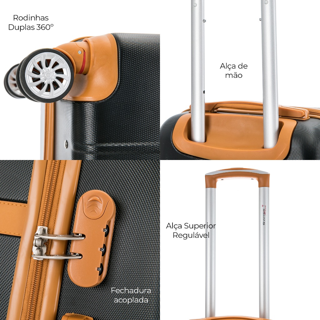 Ao viajar levamos conosco a nossa expectativa e a nossa bagagem. Para uma viagem de curta o ideal é levar uma mala pequena, pois esse tamanho acomoda bem itens essenciais para poucos dias. Se você estiver buscando por mala de viagem pequena que pode ir a bordo, compre a Mala de viagem pequena de bordo da linha Bruges da Swiss Move. Esse modelo é ideal para você, pois atende as medidas exigidas pela ANAC- Agência Nacional de Aviação Civil. Além dessa característica, a mala de viagem P é produzida em ABS, ou seja, é mais resistente a impactos, durável e impermeável. Outro fator interessa nessa mala de viagem pequena são as 4 rodas duplas que giram em 360 reduzindo o esforço de carregar a bagagem. Já no interior a mala de viagem Bruges possui bolso com zíper para comportar sapatos ou cosméticos e cinto elástico cruzado para conter e organizar as peças. Além disso, contém alça superior para facilitar o transporte em mão e possui carrinho embutido em alumínio. Por fim, para segurança do usuário a mala de viagem pequena contém um cadeado fixo com segredo.