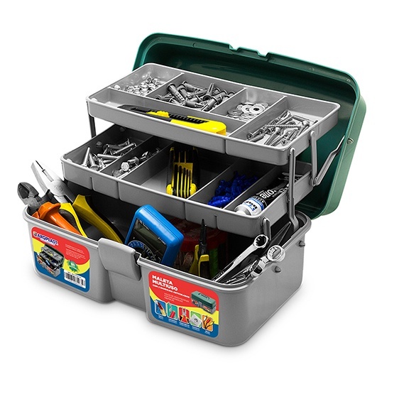 Maleta que oferece espaço e praticidade para você, organizar armazenar e transportar o que desejar (ferramentas, peças, parafusos, tralha de pesca, materiais elétricos, armarinho, etc) facilitando a realização de trabalhos profissionais e/ou domésticos. Com duas bandejas articuladas que abrem junto com a tampa e alça para maior mobilidade da caixa. Possui 1 trava em polipropileno e é feito em plástico resistente. *Fotos ilustrativas, objetos incluídos na maleta mostrados neste anúncio são simulações com fins meramente explicativos* Especificações Técnicas: Caixa de ferramentas de plástico cinza e verde Duas bandejas articuladas que abrem junto com a tampa. Braçadeira de plástico. Alça que facilita o transporte. Medidas externas: Comprimento 33 cm, Largura 20 cm, Altura 16 cm Ideal para organizar e proteger seus elementos de forma eficaz.