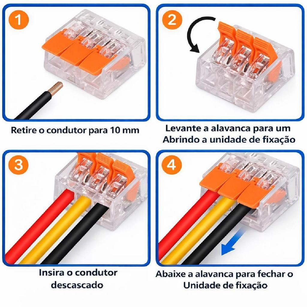 Conector Elétrico Linear 2 a 5 Vias Conexão Rápida Alta Qualidade ⚡ DESCRIÇÃO CURTA Conectores rápidos para instalações elétricas seguras e sem complicação. ✅ DESTAQUES • Disponível de 2 a 5 vias • Sistema de conexão rápida (sem parafuso) • Compatível com diversos tipos de cabos • Contato firme e seguro • Corpo transparente para inspeção visual • Ideal para iluminação, tomadas e manutenção elétrica 📦 CONTEÚDO • Kit de Conectores Lineares • 90 Peças Elétrica bem feita é simples, limpa e dura anos. ⚡😎