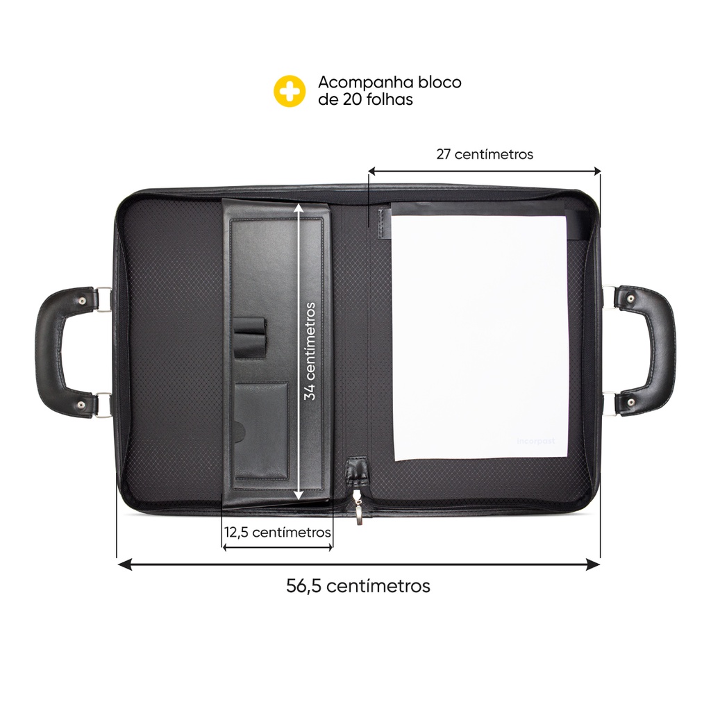 Maleta Executiva em Material Sintético com Alça INCORPAST 1561 Maleta Executiva Incorpast com alça é perfeita para o para trabalho, escola, faculdade, cursos, palestras, congressos A Pasta Maleta foi personalizada em seu interior com porta cartões, porta caneta e bolsa interna para eletrônicos até 13,3 polegadas, além de revistas, livros, pastas e demais documentos. A Pasta possui fechamento a Zíper! Produto Artesanal Fabricado no Brasil Revestimento em Material Sintético É Costurada É Almofadada Comporta eletrônicos de até 13,3 polegadas Possui Alça de mão revestida em Material Sintético Divisória para Porta Bloco Divisória para Porta Caneta Divisória para Porta Cartões Bolsa Interna de 34cm Possui Fechamento Zíper Acompanha Bloco serrilhado com 20 folhas Tamanho: Dimensões: 38 x 27 cm x 3,5 cm