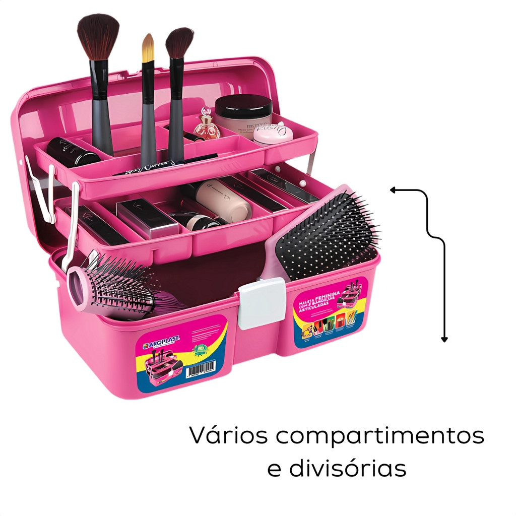 Esse anúncio contém: 01 Maleta. Maleta organizadora compacta e moderna, perfeita para armazenar e transportar diversos itens com praticidade. Possui várias divisórias e compartimentos, ideais para guardar maquiagens, acessórios, joias e outros objetos. Na cor rosa, une elegância e funcionalidade, trazendo um toque sofisticado. Conta com alça resistente para fácil transporte e fechamento com trava segura, garantindo proteção e organização. Informações do produto: Medida do organizador (AxLxC): 16cmX20cmX33cm. Cor: Rosa. Material: Plástico. Linha: Organizador. Fabricante: Arqplast. - Produto novo e em estoque; - As cores do tecido ou produto podem variar de acordo com o lote de fabricação; - Todos os produtos têm seguro contra extravio.