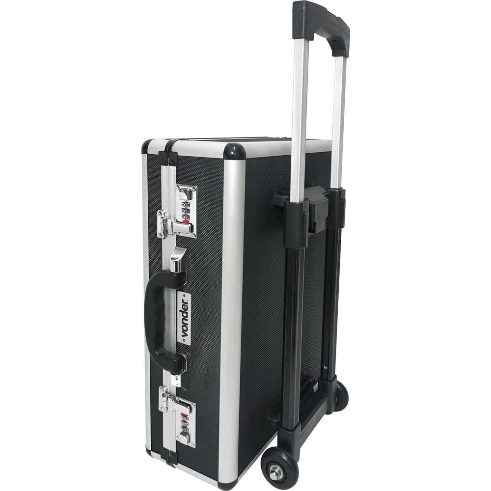 Maleta para ferramentas, profissional, 455 mm x 330 mm x 155 mm, preta, MFV 180, VONDER. Possui estrutura rígida revestida externamente em alumínio na cor preta, além de cantos plásticos e laterais reforçadas com cantoneira de alumínio, conferindo maior durabilidade. Revestida internamente com tecido reforçado com bolsos e divisões auxiliares. Acompanha dispositivo para transporte removível com alça telescópica e rodas que facilitam o transporte. Conta ainda com, travas e dobradiças em aço e fechadura com segredo personalizável. Indicada para acondicionamento e transporte de ferramentas e outros objetos em geral. Não possui divisórias. Altura total com alça telescópica estendida: 970 mm. Modelo: MFV 180 Comprimento: 455,0 mm Largura: 330,0 mm Altura: 155,0 mm Cor: Preto Material (tipo/composição): Estrutura rígida, revestida externamente em alumínio. Capacidade máxima de carga: 13,0 kgf Observação: Foto meramente ilustrativa, ferramentas e acessórios não acompanham o produto. Conteúdo da Embalagem: 1 Maleta.