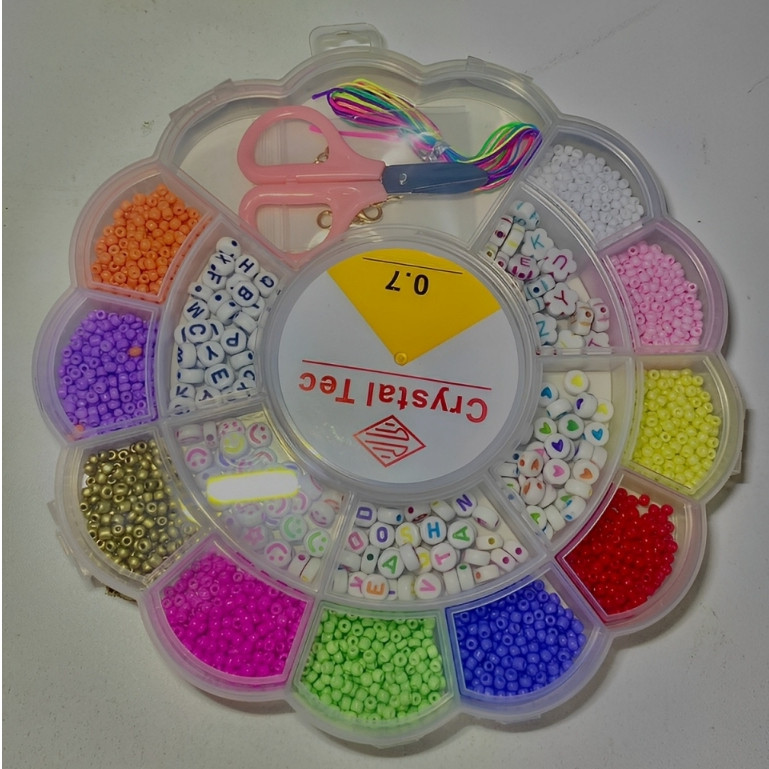 Adicione "+Seguir" à loja para obter as informações mais recentes sobre descontos ️ Maleta Infantil Kit de Miçangas + Linha Silicone + Tesoura Miçangas de Fazer Pulseiras Miçangas Colares Kit Miçangas Infantil P/ Montar Pulseiras Bolinhas Cor Maleta Transparente' é ideal para crianças e adolescentes despertarem sua criatividade. Use e abuse da sua criatividade com nossos kits, o único com pingentes fofos para você impressionar nas suas criações. Nossos kits são os mais completos e fofos pois foram desenvolvidos por profissionais qualificados com experiência em design de acessórios. O kit contém: - 1 Caixa organizadora maleta - 10 Compartimentos de corações com miçangas coloridas - 5 Compartimentos redondos com miçangas brancas - 1 saquinho de fecho mosquetão - 1 rolinho de linhas coloridas - 10 Metros de elástico de silicone da melhor qualidade - 1 Tesoura O kit perfeito para presentear e fazer pulseiras lindas e fofas.