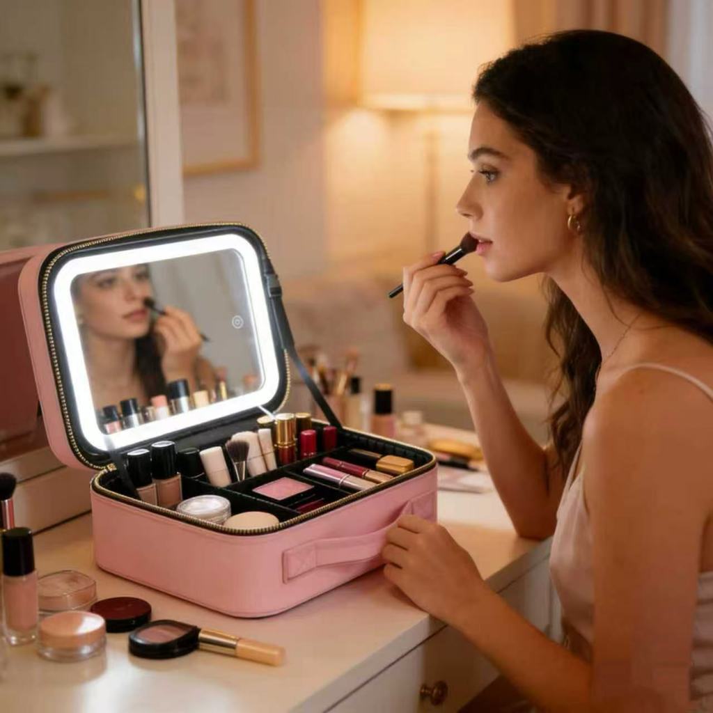 Maleta Maquiagem Profissional Necessaire Espelho Led Viagem Cor Rosa