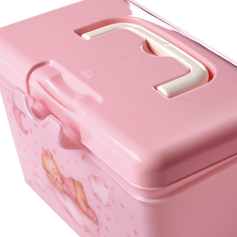 Maleta Organizadora Caixa Multiuso Ursa Rosa Plasútil Dimensao: (Comp x Larg x Alt): 19,8x11,5x12,2 cm - BPA FREE: livre de bisfenol-A e atóxico. Fabricado em plástico polipropileno (PP). - A maleta possui alça para facilitar o manuseio e trava para garantir fechamento seguro. Ela não possui divisória interna. - Sugestão de uso: Farmácia: organização de medicamentos; Documentos: informações do (a) bebê em lugar de fácil acesso; Brinquedos: separação dos itens usados diariamente..