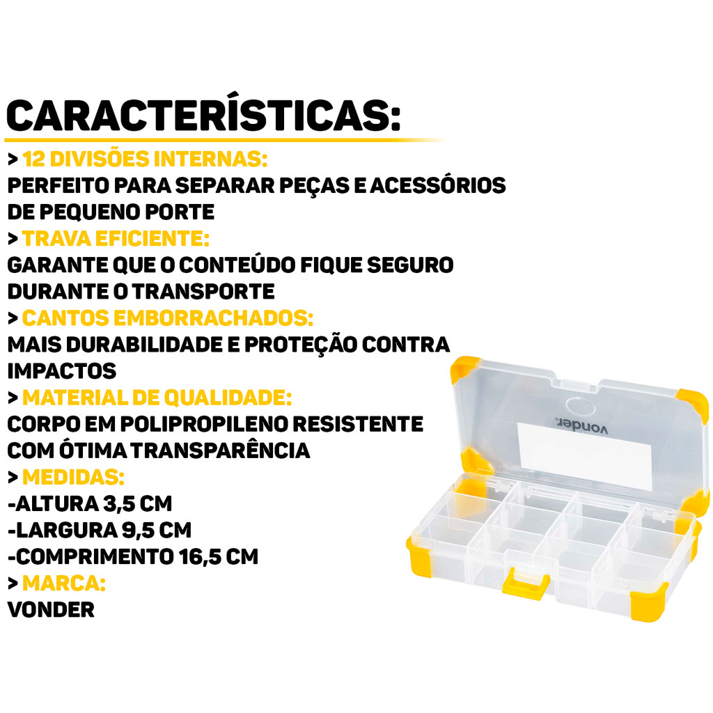 Organizador Plástico Vonder O Organizador Plástico Vonder com 12 compartimentos é a solução perfeita para armazenar pequenos objetos como parafusos, porcas, pregos, entre outros. Fabricado em plástico resistente, oferece durabilidade, sendo ideal para uso doméstico e profissional. Seu design compacto facilita o transporte e o armazenamento em estantes, bancadas ou gavetas. Características: > Possui 12 divisões, 1 trava e cantos emborrachados; > Compacto e resistente, facilita a organização em diversos ambientes, desde oficinas até o uso pessoal; > Indicado para acondicionar peças e acessórios de pequeno porte, material de pesca, parafusos, pregos, porcas, entre outros. Especificações Técnicas: > Capacidade: 2 kg; > Material: polipropileno com cantos emborrachados; > Dimensões do produto: - Comprimento: 165mm; - Largura: 9,5mm; - Altura: 35mm. - Marca: Vonder - Garantia: 90 dias contra defeitos de fabricação Vantagens de comprar na Brester: - Produto a pronta entrega. - Produto novo, com garantia de fábrica. - Nota fiscal para Pessoa Física e Pessoa Jurídica.