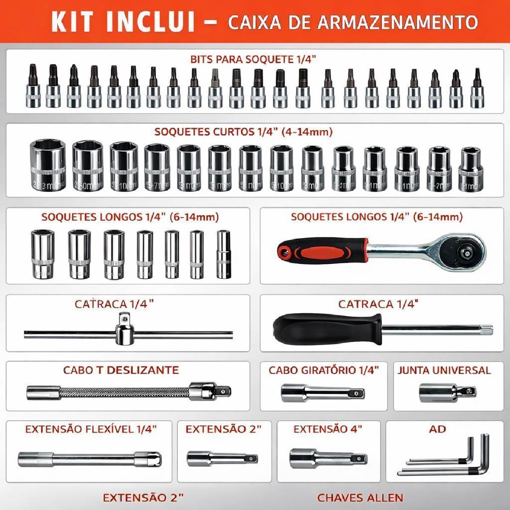 Maleta de Soquetes com Chave Catraca 1/4" em Aço Alta Durabilidade com Maleta Organizadora ✨ DESTAQUES • Kit completo de soquetes, bits e acessórios 🔧 • Fabricado em aço de alta durabilidade • Chave catraca 1/4" resistente e precisa • Acompanha maleta organizadora prática e compacta • Ideal para manutenção, mecânica e uso doméstico • Fácil transporte e armazenamento 💡 DESCRIÇÃO A Maleta de Soquetes com Chave Catraca é um kit completo para quem precisa de ferramenta confiável no dia a dia. Conta com soquetes curtos e longos, bits, extensões e acessórios, tudo organizado em uma maleta resistente. Ferramenta clássica: encaixa bem, não espana e dura. Do jeito certo. ⚙️ ESPECIFICAÇÕES • Encaixe: 1/4" • Material: Aço • Tipo: Soquetes, bits, catraca e acessórios • Acompanha maleta organizadora 📦 CONTEÚDO DA EMBALAGEM • Soquetes curtos e longos 1/4" • Bits para soquete 1/4" • Chave catraca 1/4" • Extensões, junta universal e cabo T • Chaves Allen • 01 Maleta organizadora