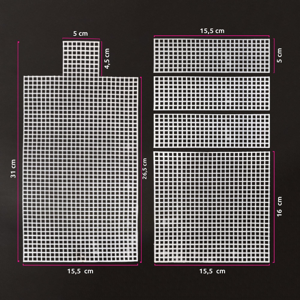 Malha chenille para bolsa 31X15,5cm ref.153945(Tela plástica) com furo 4mm Características: A malha chenille é uma tela plástica que fornece um molde pronto para bolsa de crochê e tricô, além da composição de jogos americanos ou outros trabalhos criativos, dependendo do modelo. É uma estrutura sólida, contudo, ainda assim, flexível para o desenvolvimento do trabalho, tornando-o prático e mais simples, mesmo para pessoas iniciantes. - As flores podem ser usadas para confecção de chaveiros ou detalhes que complementam a bolsa, aplicando posteriormente a sua montagem. - Estruture a forma inicial da malha chenille com alfinetes de plástico, prendedores, linha invisível ou mesmo o fio que será usado para fazer a bolsa. Quantidade: 1 unidade Cor: Branco Composição: Plástico Dimensões desmontada(aberta): Parte 1 (maior): Comprimento: 31 cm Largura (com as abas abertas): 15,5cm Parte 2 : Comprimento: 15,5 cm Largura : 15,5cm Parte 3 (3 pedaços menores) : Comprimento: 15,5 cm Largura: 5,5cm Dimensões montada: Altura: 16 cm Largura: 10 cm Largura do fundo (lateral): 5 cm Tamanho dos furos: aproximadamente 4 mm Agulhas indicadas: Você pode utilizar a agulha de crochê nº4 ou nº4,5 e para os acabamentos agulha de tapeceiro(tapestry) nº13 Fios que podem ser utilizados: Você pode utilizar fio náutico de 4mm ou 5mm. Também pode utilizar fio de malha de 15 mm ou 25mm. Ainda tem as opções de utilizar outros tipos de fios que sejam nessa proximidade de 4mm ou 5mm Origem: China Importante: o fecho de bolsa não acompanham a malha chenille, é um adereço meramente ilustrativo para demonstrar as dimensões e formatos da malha. OBS.: As cores podem sofrer leves variações de acordo com as configurações da sua tela de celular ou monitor, todavia, quase todas muito próximo do mostrado.
