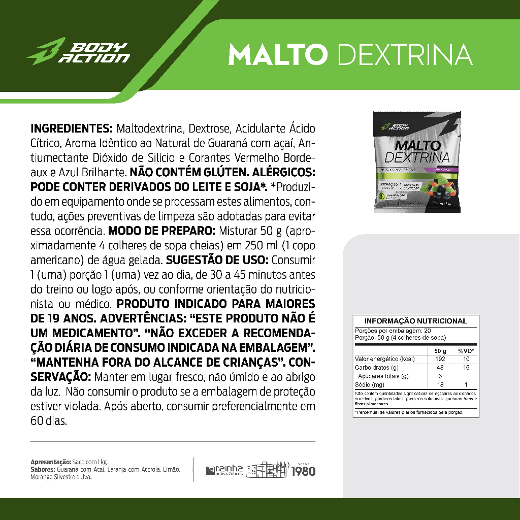 MALTODEXTRINA INGREDIENTES: Maltodextrina, Dextrose, Acidulante Ácido Cítrico, Aroma Idêntico ao Natural de Guaraná com açaí, Antiumectante e Corantes Vermelho Bordeaux e Azul Brilhante. NÃO CONTÉM GLÚTEN. ALÉRGICOS: PODE CONTER DERIVADOS DO LEITE E SOJA*. *Produzido em equipamento onde se processam estes alimentos, contudo, ações preventivas de limpeza são adotadas para evitar essa ocorrência. (Guaraná com açaí) MODO DE PREPARO: Misturar 50g (aproximadamente 4 colheres de sopa cheias) em 250ml (1 copo americano) de água gelada. SUGESTÃO DE USO: Consumir 1 (uma) porção 1(uma) vez ao dia, de 30 a 45 minutos antes do treino ou logo após, ou conforme orientação do nutricionista ou médico. PRODUTO INDICADO PARA MAIORES DE 19 ANOS. ADVERTÊNCIA: “ESTE PRODUTO NÃO É UM MEDICAMENTO”. “NÃO EXCEDER A RECOMENDAÇÃO DIÁRIA DE CONSUMO INDICADA NA EMBALAGEM”. “MANTENHA FORA DO ALCANCE DE CRIANÇAS”. CONSERVAÇÃO: Manter em lugar fresco, não úmido e ao abrigo da luz. Não consumir o produto se a embalagem de proteção estiver violada. Após aberto, consumir preferencialmente em 60 dias.