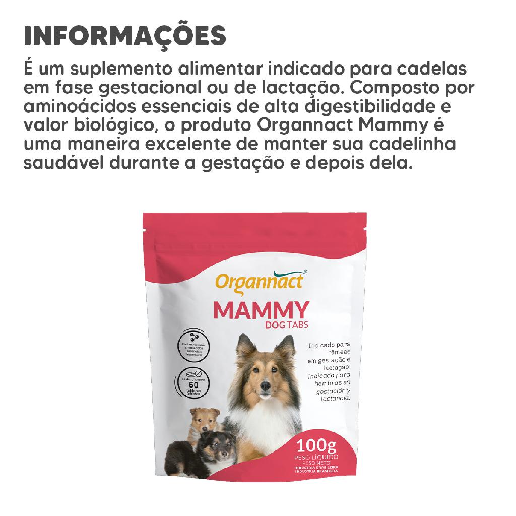 A LeluPets nasceu de uma paixão e dedicação de aproximadamente 20 anos de experiência nessa área tão incrível. Desde o início de nossa história, já são mais de 100 mil clientes atendidos. Estamos aqui determinados em fazer a diferença, democratizando e simplificando o cuidado com o seu pet para oferecer a melhor experiência para você e seu amiguinho. Mantemos nossas orelhas em pé, atentos às novidades do mundo pet para trazê-las até você. Nós somos apaixonados por pets! O seu pet é também da nossa família! Mammy Dog Tabs Suplemento Vitamínico Para Cachorro Organnact O Suplemento Vitamínico Mammy Dog Tabs Organnact indicado para cães, exemplar para complementação nutricional de fêmeas gestantes e lactantes, com um aporte nutricional rico em aminoácidos e várias outras vitaminas essenciais nessa fase melhorando o estilo de vida de nossas fêmeas na fase da criação. - Indicado para cães de todos os portes; - Ideal para Fêmeas gestantes e lactantes; - Suplemento vitamínico; - Embalagem com 100g; - Uso oral; - Atente-se à MAMMY DOG TABS ORGANNACT bula e/ou informações da embalagem; - Consulte um médico veterinário de sua confiança para o uso apropriado deste produto; - Embalagem com 50 tabletes.