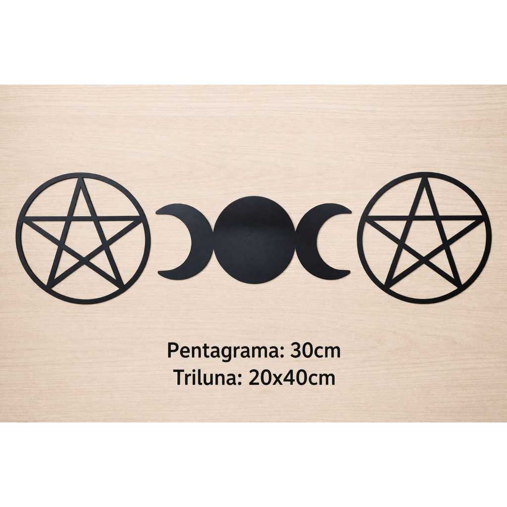 Mandala Pentagrama Material: MDF Tamanho 30 CM Triluna: Material: mdf tamanho: 20x40cm O pentagrama é uma estrela de cinco pontas de origem incerta, que esteve presente na evolução de diversas culturas. O símbolo está associado ao mistério e à magia, assim como a aspectos astronômicos e religiosos. Por ter relação com o número 5, a figura simboliza união, harmônia, equilíbrio, além de representar o sagrado e o divino.